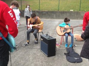 Les « Pilidous musiciens » ont improvisé un concert de guitares, accompagnés par les jeunes, qui voulaient également faire leurs gammes.